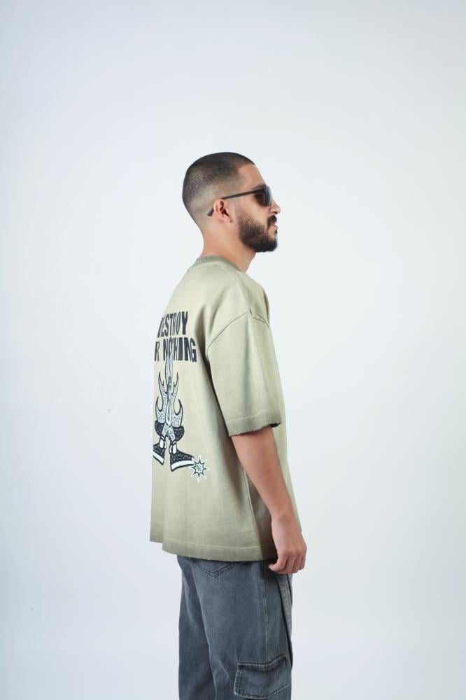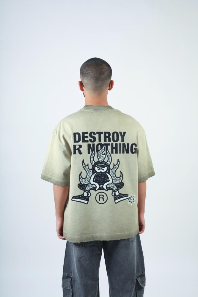 على ظهر التيشيرت، تتصدر العبارة القوية "DESTROY OR NOTHING" المشهد، محاطة برسمة فنية لشخصية كرتونية متمردة تتوسطها ألسنة اللهب، مرتدية حذاءً رياضيًا ضخمًا في وضعية قتال. هذه الشخصية تمثل روح الحرية، الصدام، والثورة على القواعد النمطية، وكأنها انفجار تعبيري عن هوية ترتدي التميّز بلا اعتذار.